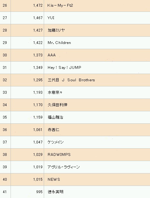 31 *10,105 魔・カ・セ・テ Tonight / 野水いおり 32 *10,054 KEY FOR LIFE / 茅原実里 33 **9,197 Dear my... / 寿美菜子 34 **9,091 愛のWarriors / GRANRODEO 35 **8,654 Planet patrol / 茅原実里 36 **8,013 たからもの / 高垣彩陽 37 **7,622 あすなろ / 鈴村健一 38 **7,489 空想メソロギヰ / 妖精帝國 39 **6,614 輝跡-kiseki- / 南里侑香 40 **6,139 Once / 原田ひとみ